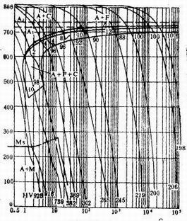 從圖中9SiCr鋼的連續冷卻轉變曲線圖分析,若得到完全馬氏體,在整個冷卻過程中,在600℃左右的范圍,要求冷速達到最大值,冷速大于等于臨界點,不和S曲線的鼻尖處相交。在此處冷速越慢,發生鐵素體析出或非馬氏體組織的形成,馬氏體組織越少。此類鋼淬透性好,要求Ms點以下的冷卻速度緩慢,可減少變形和防止開裂。