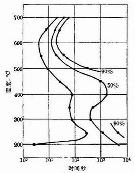 從圖中T8鋼的連續冷卻轉變曲線圖分析,若得到完全馬氏體,在整個冷卻過程中,在500-600℃左右的范圍,要求冷速達到最大值,冷速大于等于臨界點,不和S曲線的鼻尖處相交。在此處冷速越慢,發生鐵素體析出或非馬氏體組織的形成,馬氏體組織越少。為了減少變形和防止開裂,要求淬火介質在Ms點以下的冷卻速度緩慢。