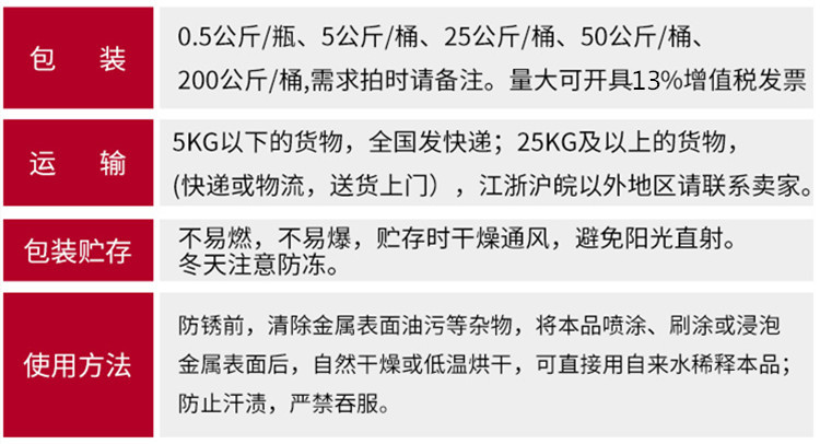 防銹劑清澈透明,無油污,易清洗。綠色環保,不含鋅、醛、重金屬、亞硝酸鈉、酚等對人體和環境有害的物質,產品符合歐盟 RoHS 限值要求;對皮膚無刺激性;夏季使用不霉變、不發臭;本品可以長期保存,無沉淀、無分層、無結晶物析出。本品在金屬表面形成一層覆蓋均勻的防銹鈍化膜,這層膜使鋼鐵表面與外界環境隔離開,起到防止銹蝕的作用。